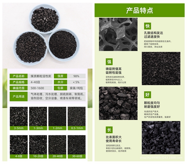 煤質(zhì)顆粒活性炭選用優(yōu)質(zhì)無(wú)煙煤為原料,采用先進(jìn)工藝加工精制而成。外觀為黑色柱狀顆粒。具有孔隙率發(fā)達(dá)、比表面積大、吸附力強(qiáng)、機(jī)械強(qiáng)度高、易反復(fù)再生、造價(jià)低等特點(diǎn)。用于有毒氣體凈化、廢氣處理、工業(yè)和生活用水的凈化處理、溶劑回收等方面。