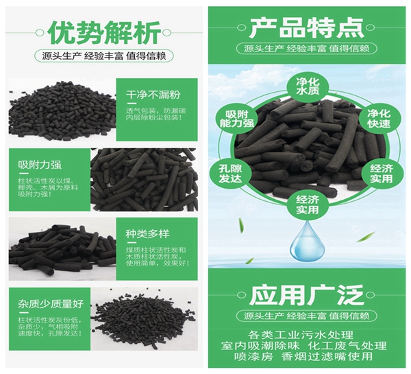2、煤質(zhì)柱狀活性炭是多孔型吸附劑,所以在運輸儲存和使用過程中,都要絕對防止水浸,因水浸后,大量水充滿活性空隙,使其失去作用。
